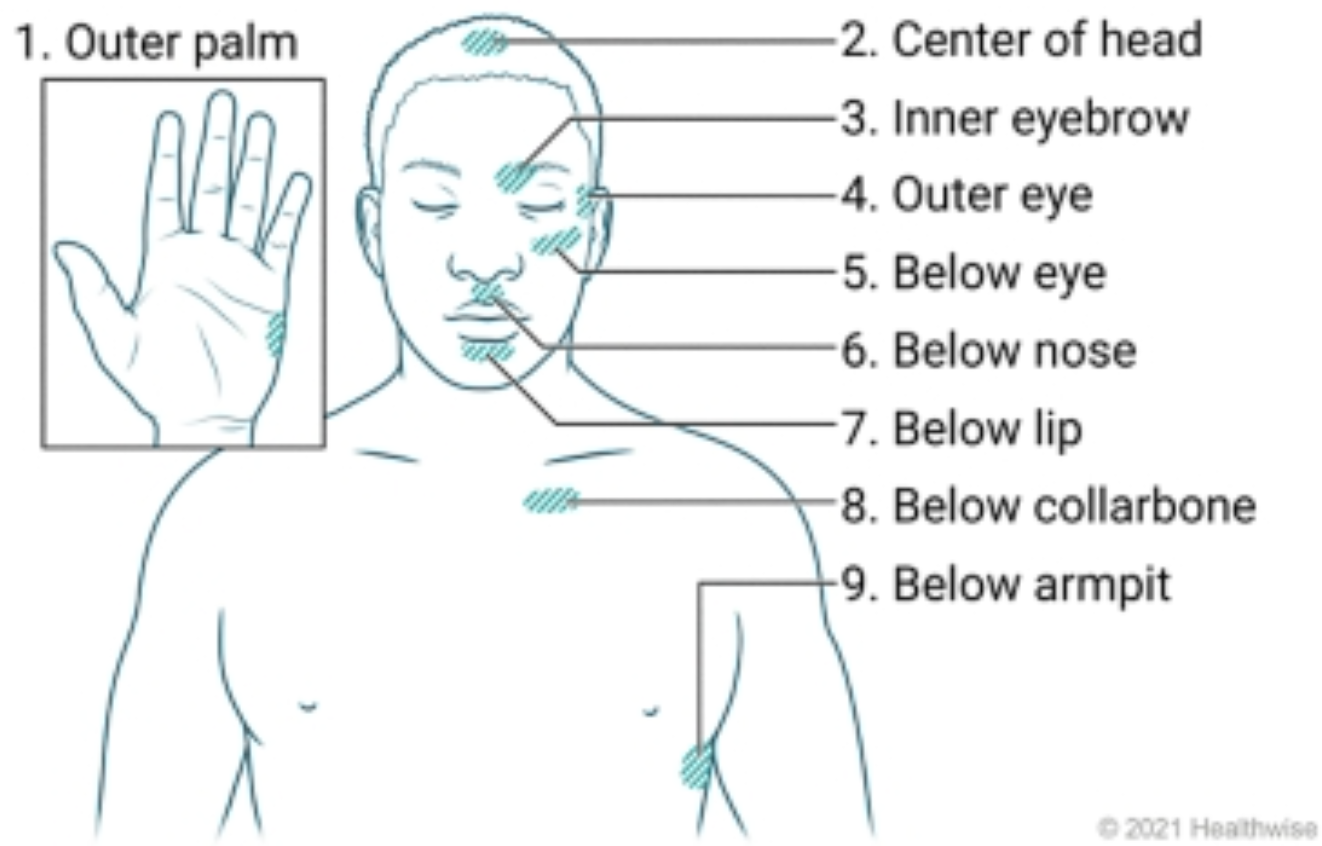 To practice you will lightly tap the areas highlighted below while repeating: “I don’t need to be productive all the time. There is healing in stillness.” at each location. Do as many rounds as necessary.